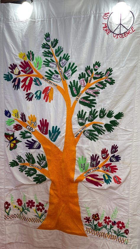 The quilts consist of individual panels, some contain stitches of home, expertly woven to belie this is not the first time they have held a needle. Others are less deft but still stark - messages are sometimes written in English as some of the refugees are losing their language as their culture is eradicated, while others are learning new skills such as English. They bear their names, their hope, but also heart-breaking messages. The messages in each panel focus on gender based violence, the role of men but also their rights.