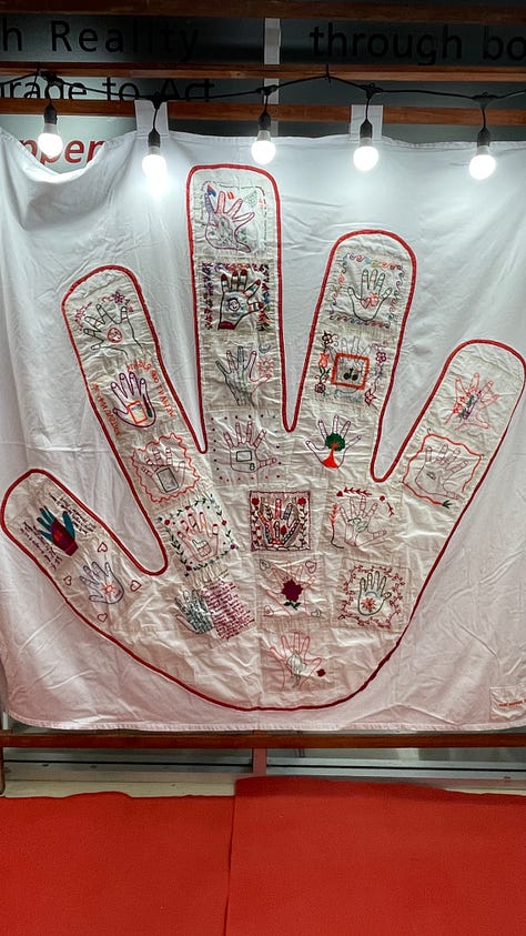 A series of panels are made into the shape of a hand where the women explore the meanings and memories hidden in their hands.